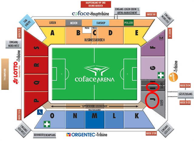 | Tickets: | 25 Stehplätze in dem Gästeblock Block J à 18,50 EUR und 15 Sitzplatzkarten im Gästeblock Block I à 40,50 EUR. |