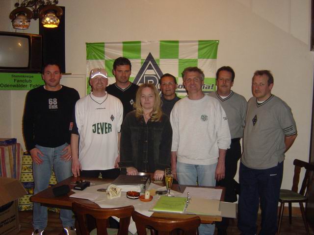 neuer Vorstand (v.l.n.r.): Klaus Arras, Frank Landzettel und Matthias Rückert (alle Vorsitzende des Fanclubs), Kerstin Kredel (Vorsitzende des Vergnügungsausschusses), Achim Frank (Kassenwart), Otto Slamal, Dino Noll und Hans Sroka (alle Vergnügungsausschuss) |