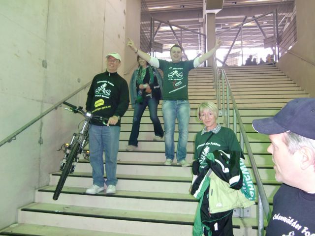 Wir machten uns dann um 12 Uhr mit dem Bus Richtung Stadion auf. Dort ging es dann zunächst ins Fanhaus, wo wir zunächst Michael Feick trafen, der extra wieder von seiner Privatfeier nach Gladbach gefahren war, um beim finalen Tag dabei zu sein. Auf dem Rad stand er da und grinste über beide Backen. Natürlich war Frank schon informiert und besorgte ihm am Vorabend noch schnell eine Eintrittskarte. Zusammen genossen wir dann ein 5-Liter-Fässchen Jever, bevor wir zum P4 gingen, wo wir den Abholbus geparkt hatten. Um 14.30 Uhr holten wir ca. 8 Räder und gingen damit zum ausgemachten Treffpunkt am Stadion, Ecke Nordkurve. Dort erwartete uns schon Herr Ungerechts, stellvertretender Leiter der Tafel Mönchengladbach e.V., der uns begrüßte und sich nochmals sehr über die Aktion beeindruckt zeigte. Wir schauten vorab nochmals auf unseren aktuellen Spendenstand, der bei über 5.200,00 EUR stand. Kurzentschlossen rundeten wir diesen von unserem Fanclub auf die schöne Summe 5.454,00 EUR auf, die sich auch nach Halbierung in 2 x schöne und stolze 2.727,00 EUR für jede der beiden ausgewählten Tafeln aufteilte.