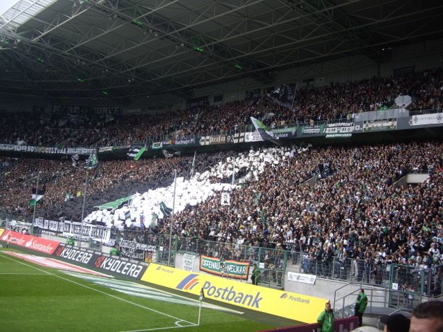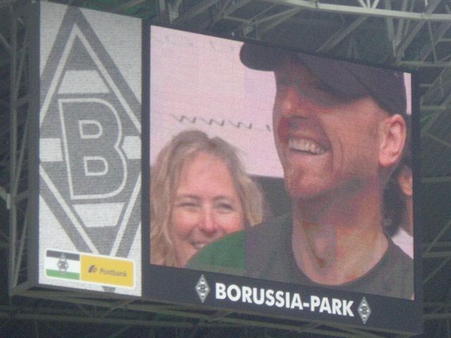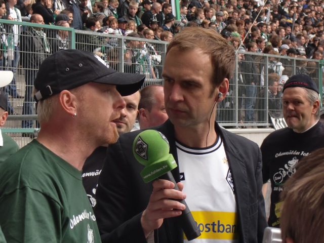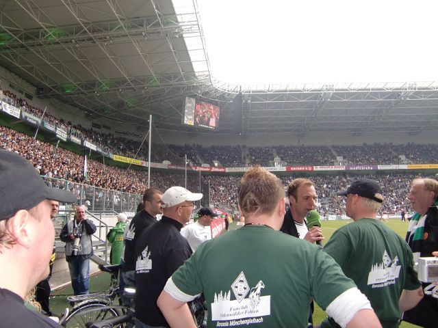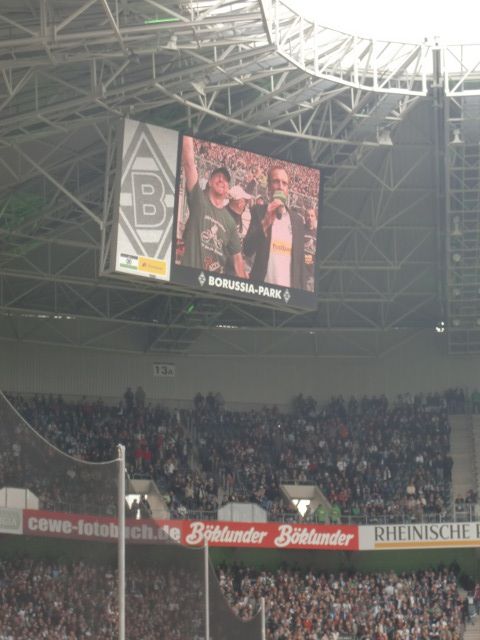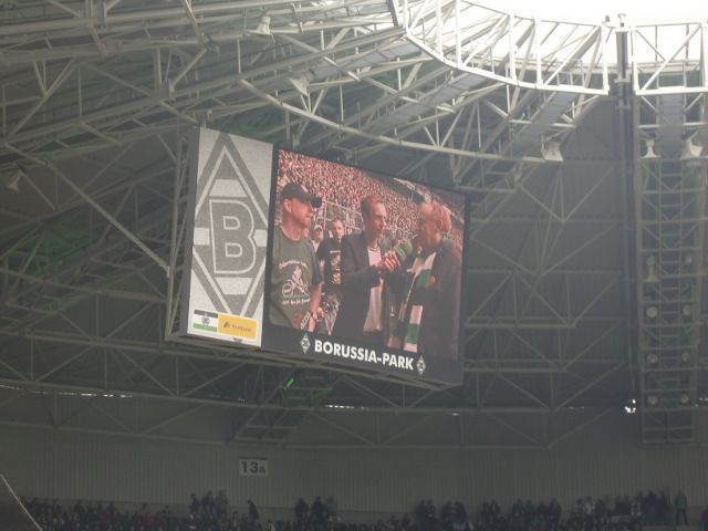 Danach holte uns dann eine Mitarbeiterin der Borussia ab und wies uns kurz in den Ablauf ein. Wir gingen über ein Marathontor Nord/West in Richtung des Rasens und postierten uns dort. Stadionsprecher Knippi stand schon im Innenraum, sagte die Aktion an und dann fuhren wir die paar Meter bis Knippi vor. Ein kurzes Interview mit Frank, der unterdessen noch im Zusammenhang mit unserer Fahnen-Aktion in K*** das „Cologne-Lied“ anstimmte und das ganze Stadion mitsang, dann noch ein Interview mit Herrn Ungerechts, und schon war das kleine Spektakel vorbei. Schade, dass sich kein Borussia-Offizieller mal kurz dazu gesellte. Aber es war dann am Ende doch für alle ein tolles Erlebnis, im prall gefülltem Borussia-Park vor der Nordkurve zu stehen.