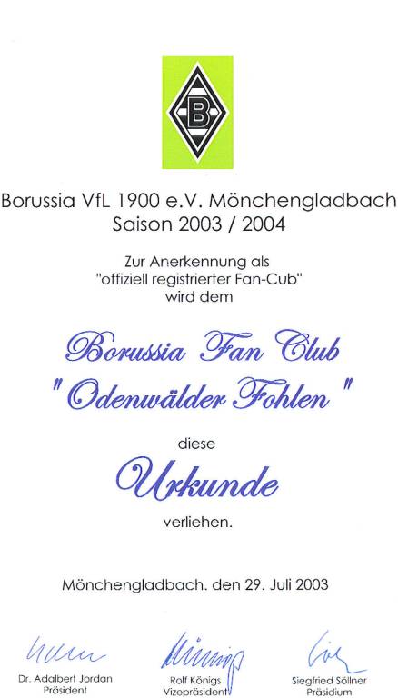 Am 1.8.2002 um 19.00 Uhr war es soweit. Nach umfangreichen Vorplanungen gründeten wir in einer Feierstunde im Sportzentrum in Fränkisch-Crumbach im schönen Odenwald den Borussia Mönchengladbach-Fanclub "Odenwälder Fohlen".