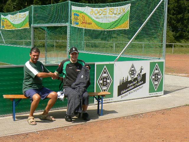 Unser Tippsieger Josef (rechts) mit seinem Gewinn, einem Bademantel und Duschtuch von Borussia, überreicht von Matthias